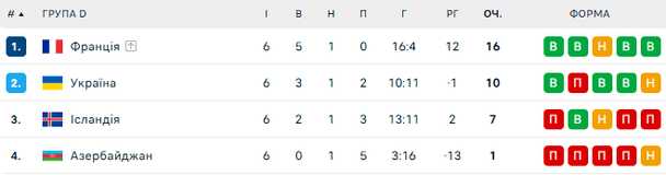 Збірна України завершила відбіркову кампанію на другому місці у своїй групі з 10 очками, обігнавши Ісландію (7 балів), але поступившись Франції (16). Азербайджан посів останнє місце з одним пунктом.